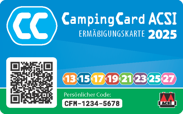 CampingCard ACSI umfasst einen Campingführer mit einer Ermäßigungskarte. Die Rabattkarte wird aus dem Campingführer genommen und ist mit einem QR-Code versehen. Mit dem QR-Code können Sie Ihre Ermäßigungskarte online registrieren. Wenn Sie das getan haben, kann der Campingplatz Ihre Rabattkarte einscannen und Sie können besonders schnell einchecken. Sie können Ihre Daten auch auf die Rückseite der Ermäßigungskarte schreiben. Der Campingplatz kann diese dann manuell übernehmen. Bei Vorlage einer gültigen Ermäßigungskarte berechnen die teilnehmenden Campingplätze den besonders günstigen Preis für zwei Personen. So einfach ist das!