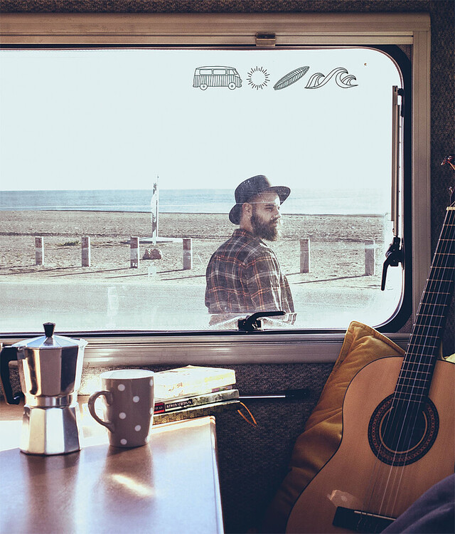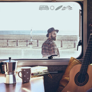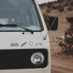 Schwarzes Autoaufkleber-Set aus hochwertiger gegossener Folie für jahrelange Haltbarkeit im Außenbereich und auf jedem Fahrzeugtyp. Perfekt für das Auto, den Bus, Camper, das Wohnmobil oder sonstige Oberflächen im Freien. Für alle, die vom nächsten Roadtrip ans Meer träumen. Dank der Träger- und Transferfolie bleiben auf dem Fahrzeug nur das filigranen Motiv zurück.