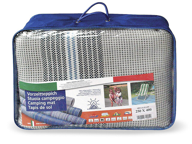 Der ideale Teppich für Zelte, Vorzelte, Terrassen und Balkone. Aus strapazierfähigem Polypropylen-Bändchengewebe, wiegt ca. 500 g/m².