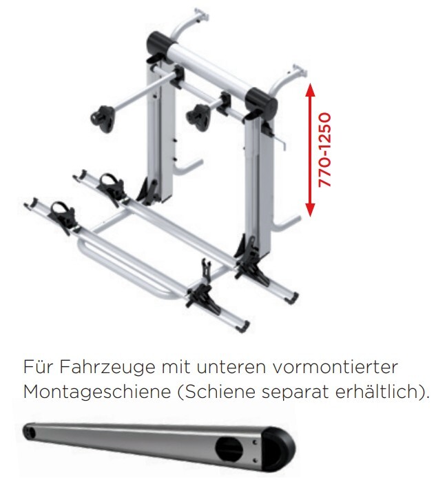 - Die Fahrradhalter können schnell von links nach rechts und von oben nach unten verstellt werden. Außerdem sind sie abschließbar (serienmäßig beim längsten Halter, optional beim anderen Halter