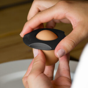 Einfach Cregg mit den Schneiderädern nach unten auf das Ei, leicht drücken und drehen. Jetzt ist die Eierschale zerschnitten und man kann die obere Hälfte des Eis abheben. Danach kann das stilvoll geöffnete Frühstücksei auf dem Cregg deponiert werden – so kommt die zweite Funktion ins Spiel. Denn er ist auch Eierbecher. Ein echt multifunktionales Produkt.