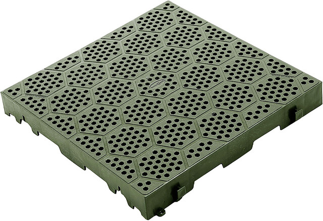 Deck-Fit Bodenplatte aus Kunststoff ermöglicht durch die besondere Beschaffenheit des Unterteils den Durchfluss von Wasser und das Verlegen von elektrischen Kabeln. Es gewährleistet zugleich eine hohe Stabilität. Die voll perforierte Oberfläche ermöglicht eine optimale Belüftung des darunter liegenden Bodens und verhindert lästige Wasseransammlungen. Schnelle und einfache Montage dank praktischer Verbindungshaken.