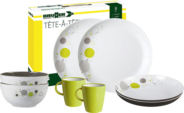 BRUNNER Geschirrset Melamin Space 8-tlg. je 2 Suppen-, Essteller, Müslischale, Henkel becher Fb. weiß / grau / lime