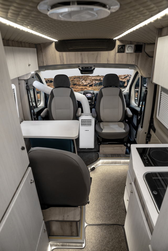 Ein leistungsstarkes und tragbares Klimasystem, speziell für Campervans entwickelt. Es vereint die Funktionen Kühlen, Lüften und Entfeuchten in einem Gerät und verfügt über ein innovatives Abluftsystem für heiße Luft. Der Aufbau ist werkzeugfrei und benutzerfreundlich. Temperaturbereich: 16–30 °C, maximaler Geräuschpegel: 56 dB, Energieeffizienzklasse: A.