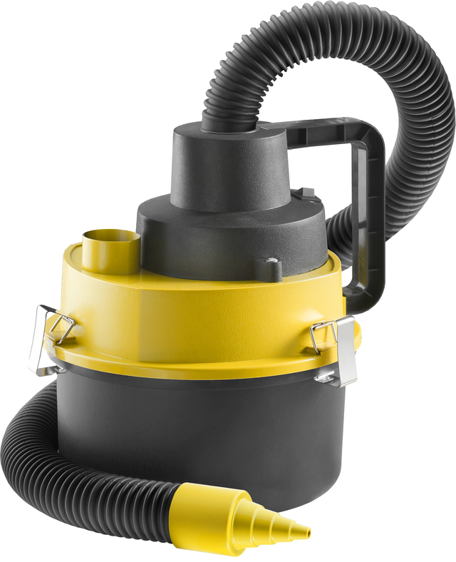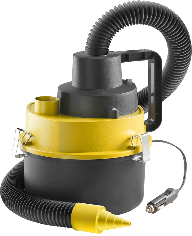 Gleichstrombetriebener Staub- und Flüssigkeitssauger mit stabilem Kunststoffgehäuse, flexiblem Saugschlauch und langem Anschlußkabel mit 12V ZA-Stecker. Mitgeliefertes Zubehör: Fugendüse, Teppichdüse, Aufpump-Adapter.