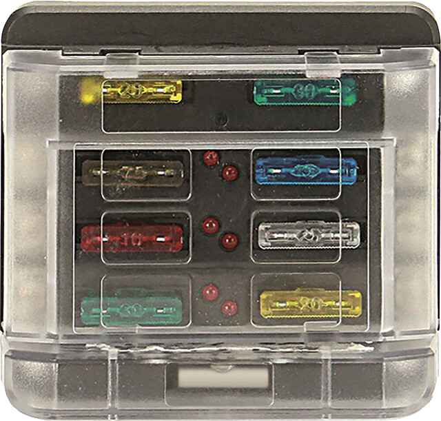 Kompakter Plus-Stromverteiler mit 6 Plus-Ausgängen (M4). Die Stromzufuhr erfolgt über einen Zentraleingang (M5). Defekte Sicherungen werden durch LED angezeigt. Ausgänge bis 30 A belastbar. Die Gesamtbelastung beträgt 100 A. Lieferung ohne Sicherungen (Typ: FS). Betriebsspannung: 12 V / 24 V.