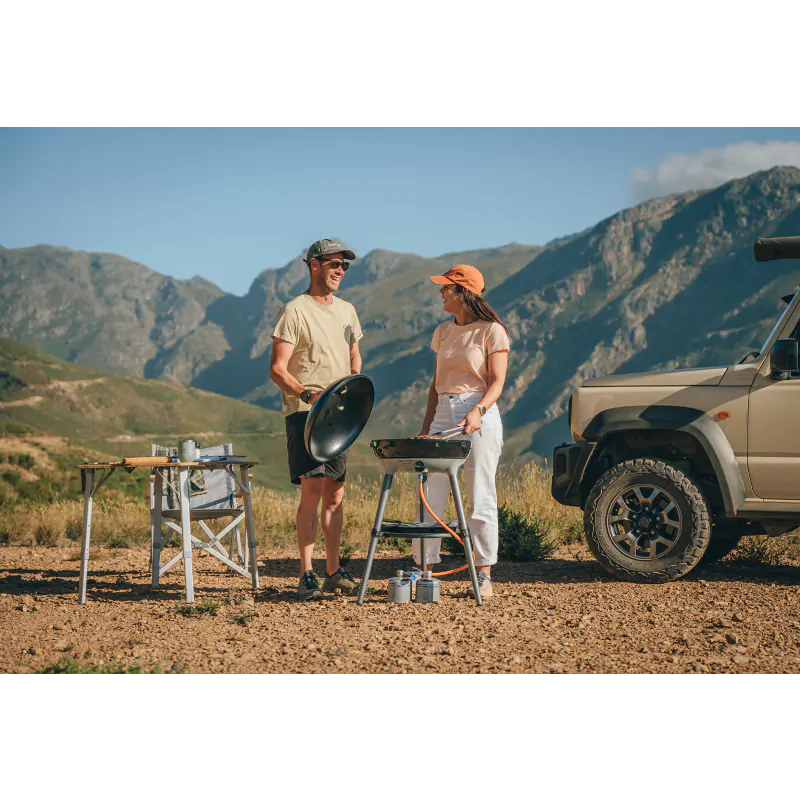 • Zweiteilige, abnehmbare Aluminiumbeine für Umbau zum Tischgrill