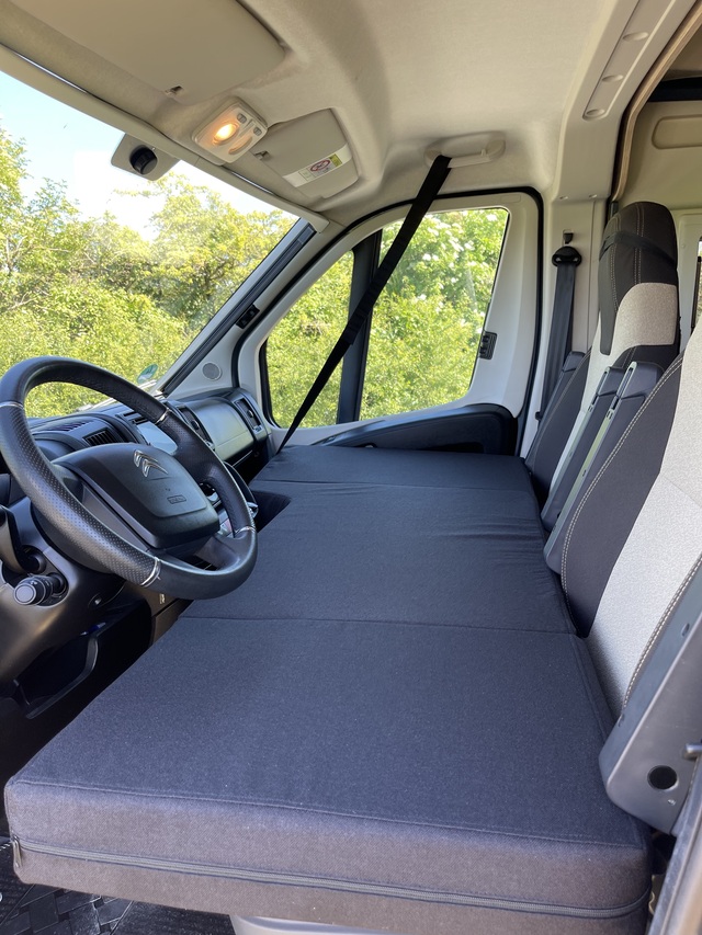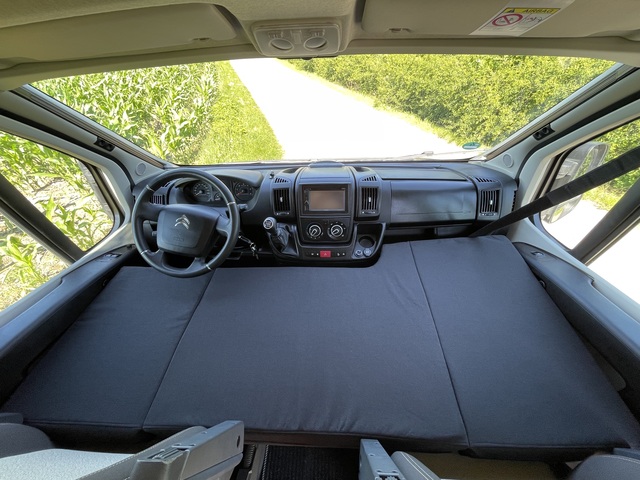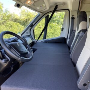 Mit dem Fahrerhausbett ist es möglich, schnell, einfach und bequem, eine weitere Schlafmöglichkeit auf den Sitzen im Fahrerhaus zu schaffen.