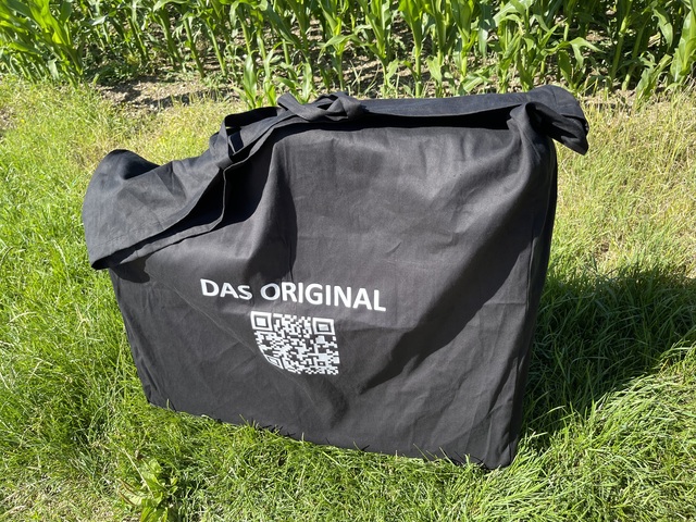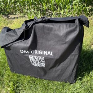 Transporttasche für Betten aus festem, strapazierfähigem Stoff. 2 Trageschlaufen und Klettverschluss zum Verschließen.