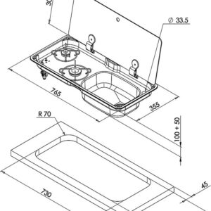 Kocher-Kombination INOX 2-flammig, Spüle rechts, Glas 1-tlg., elektronische Zündung 12 V, inkl. Dichtung und Ablauf.