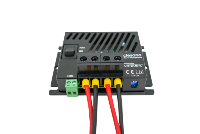 Einfache Elektroinstallation und noch mehr Autarkie! Das Clesana Power-Management vereint die Funktionen eines Relais und eines DC/DC-Ladegeräts. In Kombination mit einer Stützbatterie lässt sich die Clesana C1 mit dem Clesana Power-Management dank der vorkonfektionierten Kabel schnell und einfach installieren. Über den Steuereingang wird der Stromfluss bei Nutzung der Clesana C1 von der Stützbatterie kommend freigegeben, im Standby der Clesana C1 wird die Stützbatterie über das Clesana Power-Management mit 2 A Ladestrom geladen. Die Ansteuerung erfolgt ganz einfach über ein 12 V Dauer-Plus Kabel. Auch bei Ausfall der Bordbatterie kann die Clesana C1 dann noch über die Stützbatterie betrieben werden.