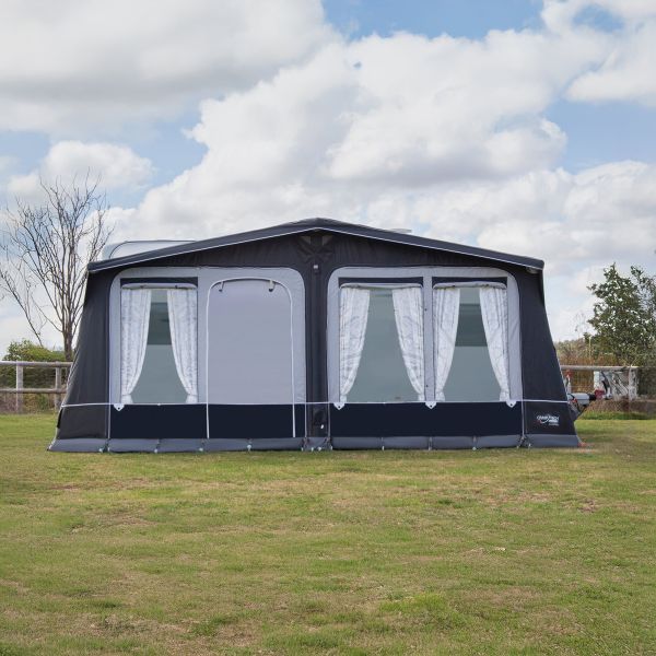 Das Dauervorzelt Diamant Air macht jeden Campingurlaub zum Highlight. Denn optimales Raumklima in Verbindung mit hoher UV-Stabilität und modernstem Vorzeltmaterial machen das Zelt zum perfekten Urlaubsbegleiter in allen Regionen Europas. Dank der Wände aus Camptex All Season Gewebe schützt es hervorragend vor den Elementen. Außerdem sind die Nähte im Dach versiegelt, sodass der Quelleffekt des Nahtmaterials keine Rolle mehr spielt. Dank des Luftgestänges lässt sich das Zelt schnell und einfach aufbauen. Es steht bei Wind und Wetter absolut stabil. Mit festen Fensterklappen ausgestattet, ist das Diamant als hochwertiges Reisezelt, aber auch als Saisonzelt einsetzbar. Inkl. Sonnendachanbringung am Giebel, Camptech Faulstreifen Luxus und Mehr-Ventil-System mit einem zentralen Aufblasventil mit Absperrkammern.