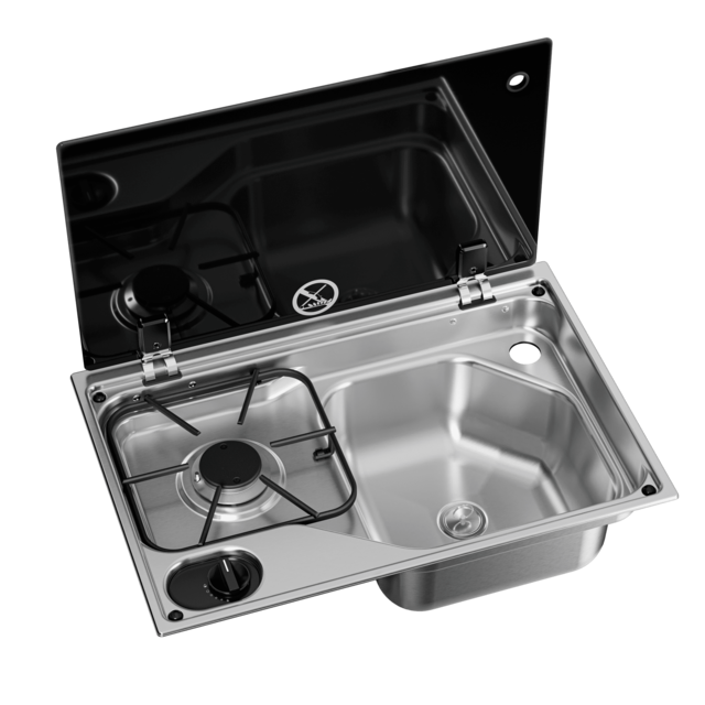 Die Dometic CVC1525G ist eine kompakte Kombination aus Gaskochfeld mit einem Brenner und rechtsseitigem Spülbecken, die eine komfortable Küchenausstattung für Reisemobilküchen bietet. Dank der ergonomisch angeordneten Bedienknöpfe haben Sie alle Kochvorgänge perfekt im Griff. Wenn keine Töpfe auf dem Kochfeld stehen, können Sie die Glasabdeckung schließen, um zusätzliche Arbeitsfläche zu gewinnen – und gleichzeitig Ihr Kochfeld zu schützen. Die Kochfeld-Spüle-Kombination wird flächenbündig in die Arbeitsplatte eingebaut. Siphons und Wasserhähne sind separat erhältlich (Sie können z. B. den Dometic Wasserhahn AC539 und den Siphon AC530 verwenden). Das passende Hahnloch ist bereits vorgebohrt.