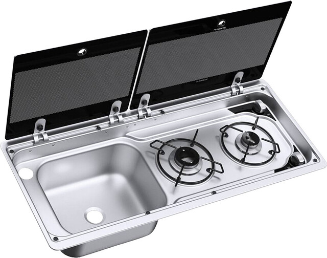 Kombination aus 2-flammiger Kochmulde und Spüle mit Glasabdeckung und elektronischer Zündung.