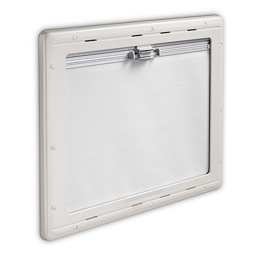 Komplettfenster für Reisemobile und Caravans, fertig vormontiert mit Doppel-Acrylglasscheibe und integrierten Verdunklungs- und Insektenschutzrollos. Mit der praktischen Zentraleinhandbedienung lassen sich beide Rollos verbinden und in verschiedenen Positionen arretieren.