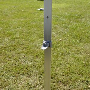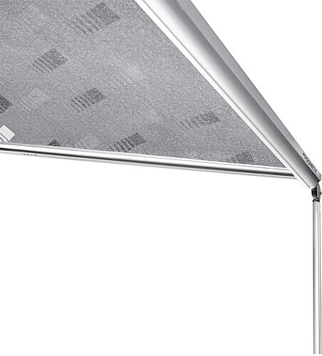 - Minutenschneller Auf- und Abbau – Stützbeine und Spannstangen werden aus der Frontleiste ausgeklappt