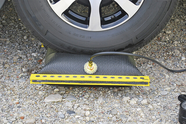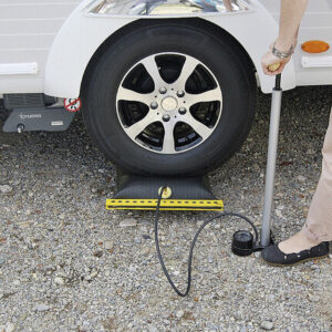 Für Wohnmobile und Wohnwagen. Der EMUK Air-Lift ist ein hochbelastbares, verschleißfestes, benzin-, öl- und säurefestes Druckluft-Hebekissen, welches speziell für Wohnmobile und Wohnwagen entwickelt wurde. Alle Bodenunebenheiten und Höhenunterschiede des Untergrundes können stufenlos von 1,5 cm bis 20 cm ausgeglichen werden. Die Tragkraft des EMUK Air-Lift beträgt 11 Tonnen und schlägt dabei alle bisherigen Bestwerte im Vergleich mit herkömmlichen Ausgleichskeilen. Die Handhabung ist dabei äußerst mühelos und komfortabel. Das Kissen wird einfach unter dem jeweiligen, anzuhebenden Rad platziert. Mit einer Hand- /Fußpumpe oder einem 12 V Minikompressor kann das Gefährt innerhalb von ca. 4 min. auf engstem Rangierraum ausnivelliert werden. Die Herstellung des EMUK Air-Lift erfolgt in Manufaktur „Made in Germany“ mit hochwertigsten Materialien in sauberster handwerklicher Qualität. Pulverbeschichtete leichte Aluminium Leisten stabilisieren dabei den mit hochfesten Aramidfasern verstärkten Gummi-Druckkörper. Eine besonders dicke Gummihaut (Sandwichbauweise) verleiht dem Druckluftkissen ausreichenden Schutz gegen äußere Einwirkung durch Steine, Geröll oder Scherben. Das Riffelprofil bietet den anzuhebenden Rädern rutschfesten Halt.