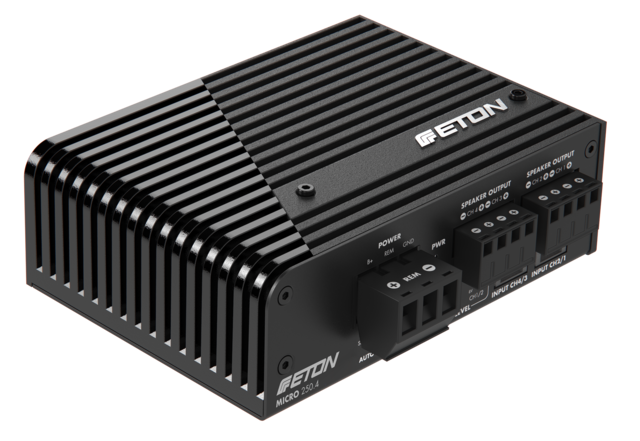 ETON MICRO 250.4 – sehr kompakte 4-Kanal Endstufe, Class-D Digital Verstärker, perfekt für PKWs und Reisemobile. Kraftvolle ETON 4-Kanal Endstufe im Micro-Format: ultrakompakt, mit asymmetrischer Leistungsverteilung von 2 x 45 Watt @ 4 Ohm + 2 x 80 Watt @ 4 Ohm. Klein, praktisch und stark, beeindruckt dieser Verstärker mit Abmessungen von 127 x 94 x 42 mm – minimale Masse und dabei maximale Power! Das innovative Kühlrippendesign sorgt für eine effiziente Wärmeableitung und bildet zusammen mit der ausgereiften Class-D Verstärkertechnologie die Basis für Leistung und eine überzeugende Klangperformance. Der MICRO 250.4 Amplifier besticht durch seine vielen Features: Dazu gehören aktive 12 dB Hoch- und Tiefpassfilter, einstellbar im Frequenzbereich zwischen 50 Hz und 5000 Hz, und Kanal getrennt einstellbare Level Gains zwischen 0,45 und 8 V. Der ETON Verstärker verfügt auch über High- und Low Level Eingänge, eine Auto-Sense On Funktion und ist für Fahrzeuge mit Start-Stopp Automatik geeignet. Abgerundet wird die clevere Konstruktion durch modulare, einstellbare Befestigungshalter und moderne Anschlussstecker, mit denen sich der 4-Kanäler einfach und flexibel in Fahrzeug installieren lässt zum Beispiel im Handschuhfach, hinter dem Armaturenbrett oder unter einem der Sitze. Die MICRO 250.4 ist engineered in Germany.
