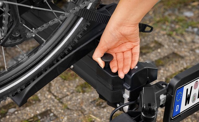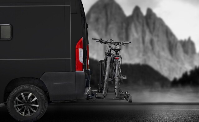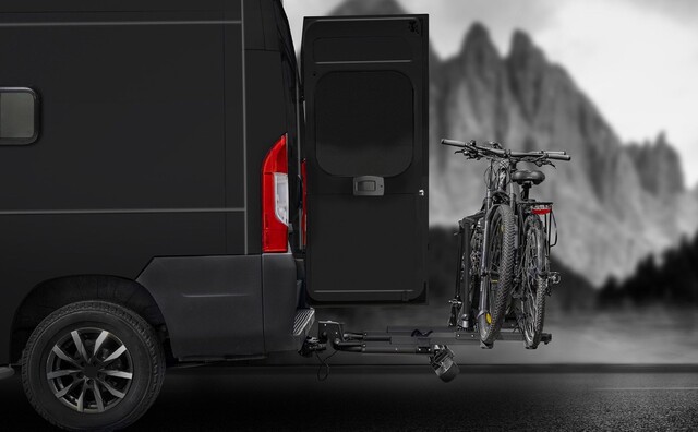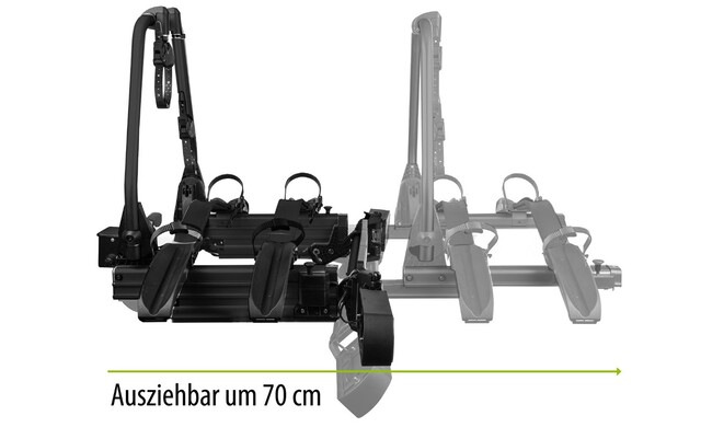 Zum Transportieren von Fahrrädern auf der Anhängerkupplung speziell für Kastenwagen und Wohnmobile, Familienbusse, Hochdachkombis mit Flügeltüren sowie PKWs. 70cm Schiebeweg ermöglicht die Öffnung von bis zu ca. 85cm breiten Türen.