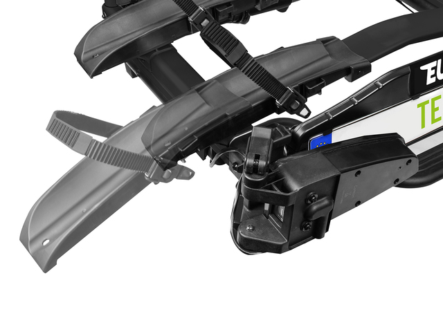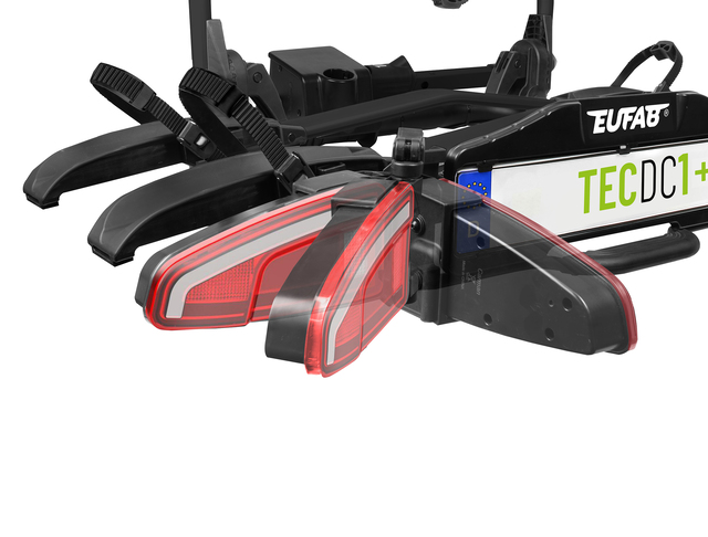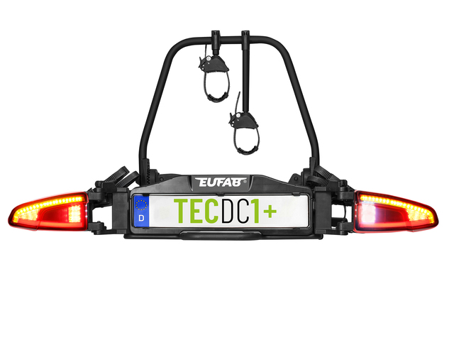 Der EUFAB TECDC1+ ist ein Kupplungsträger für zwei Fahrräder oder E-Bikes, mit schwarzem Design und modernen LED-Rückleuchten. Dank Abklappfunktion per Fußpedal, Schnellverschluss-System und vormontierter Lieferung ist er besonders benutzerfreundlich. Ideal für Fahrzeuge mit großen Heckklappen. Die stabilen Stahlschienen eignen sich für Radstände bis 130 cm, Reifenbreiten bis 3,25 Zoll und einen Schienenabstand von ca. 24 cm.