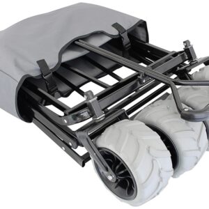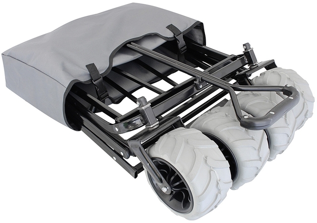 Faltbare Gepäckwagen, speziell für den Einsatz auf dem Strand eingestellt. Die großen Räder aus Gummi sorgen für leichten Transport und verhindern, dass der Wagen im Sand stecken bleibt. Leicht zu falten und braucht wenig Platz. Sekundenschnell bereit durch ein ganz neues Faltsystem. Zusammengeklappt ist er wie ein Trolley zu transportieren.