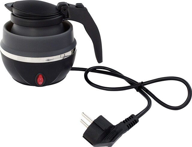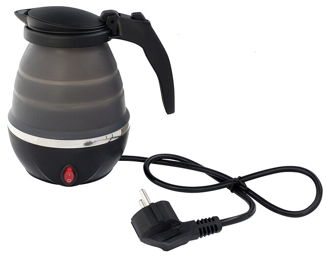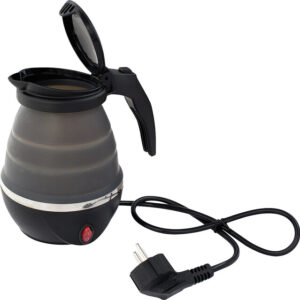Faltbarer Wasserkocher, praktisch und platzsparend. Aus Silikon mit PP-Boden und Edelstahl-Heizelement.