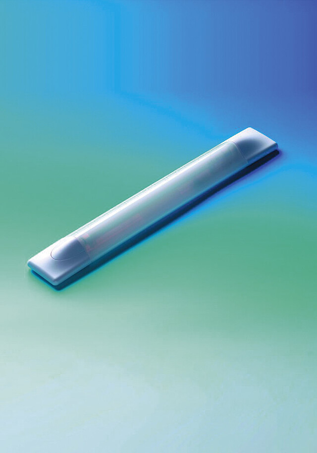 Aufbauleuchte aus Kunststoff, warmweiß mit Druckschalter.