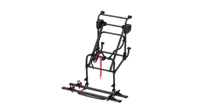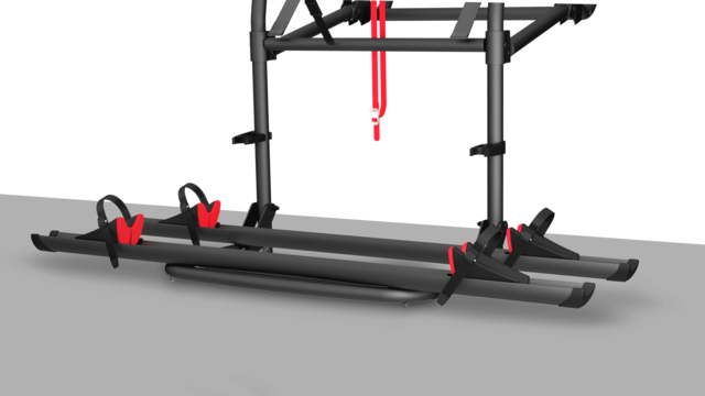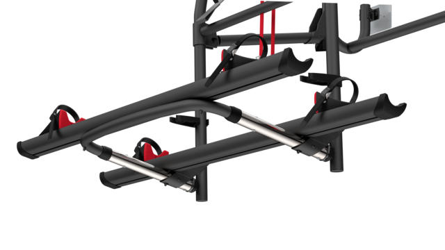 Bei diesem Modell wird die obere Struktur mit doppelten Bohrungen versehen, um das horizontale Stützrohr im Falle einer am Fahrzeug angebrachten Rückfahrkamera verschieben zu können. Ein optionaler unterer Halterungssatz ist erhältlich, um den Fahrradträger an Fahrzeugen zu installieren, die bereits mit unteren und oberen Montageprofi len ausgestattet sind.