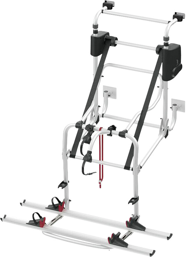 Motorisierte Carry-Bike für Wohnmobile, der Aufl agebügel lässt sich um 77 cm absenken und ermöglicht so ein müheloses Be- und Entladen der Fahrräder. Funktionssteigerung des Carry-Bikes beim Schließen dank des Endanschlags.