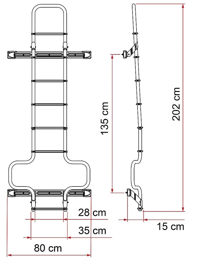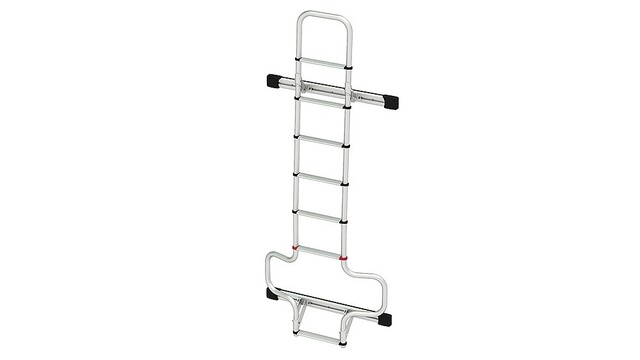 Robuste und leichte Aussenleiter für Wohnmobile. Rohre aus eloxiertem Aluminium mit 30 mm Durchmesser, 2 mm Dicke, Auftritt 28 cm, Aussenmaße 35 cm, gemäß der UNI EN 131 Norm abgeändert. Rutschfest. Kombinierbar mit Carry Bike 200 DJ. Geeignet für Fiat Ducato, Citroen, Jumper und Peugeot Boxer und Ford Transit mit doppelter Hecktüre ab 2006.