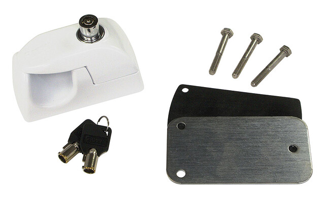 Zum Nachrüsten der Security 31 und 46, die damit noch sicherer werden. Komplett mit Schlüssel und innerer Gegenhalterung. Aus weiß lackiertem Aluminium.