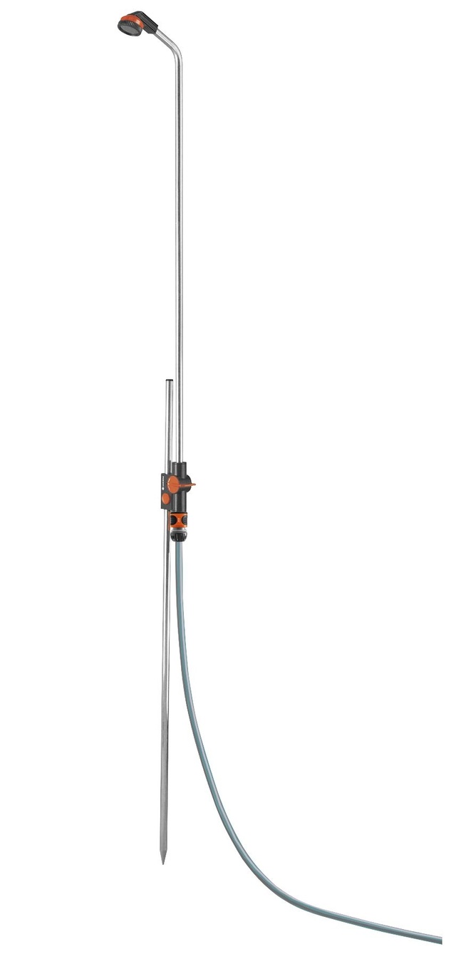 Das erfrischende Vergnügen an heißen Tagen! Mit Spike: einfach in Rasen oder Sonnenschirmständer stecken. Stufenlose Höhenverstellung über Druckknopf. Mit Regulier- und Absperrventil zur Mengenregulierung. Großer Duschkopf mit weichem Brausestrahl.