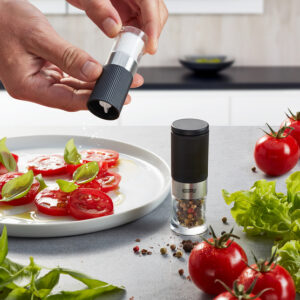 Klein, oho und ideal zum Nachwürzen! Ob am Esstisch, beim Camping oder auf der Picknickdecke– die zwei Mini-Mühlen mit Aromadeckel in der pur gestalteten Menage liefern Würze in stylishem Outfit. Ausgestattet mit Keramikmahlwerk, das von grob bis fein stufenlos verstellbar ist.