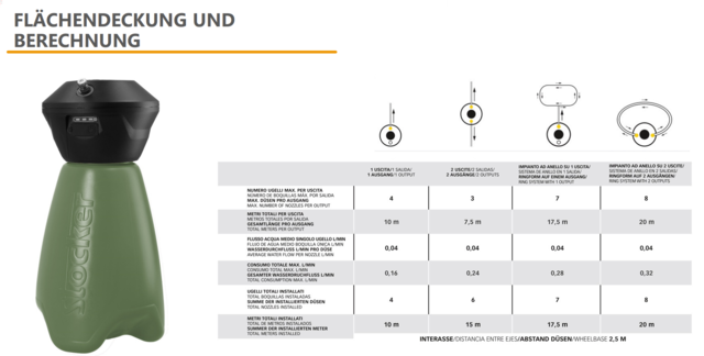 Zwei ultra-feine Nebelstrahldüsen verteilen die Flüssigkeit homogen und führen zu einer höheren Effizienz als herkömmliche Sprühgeräte. Die FPM Dichtungen erlauben den Gebrauch von aggressiven Mitteln.