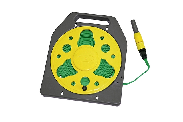Schlauchtrommel mit 2 Schnellkupplungen und Diameter Kupplung 16 mm. Trommel ist für die Festmontage geeignet.