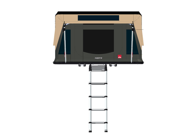 - Teleskopleiter: Die Leiter ist in den Klappmechanismus des Vista integriert und kann bis zu 210 cm ausgefahren werden, wodurch sie für die meisten Fahrzeuge geeignet ist. Für höhere Fahrzeuge ist eine Verlängerung (bis zu 60 cm) als Zubehör erhältlich