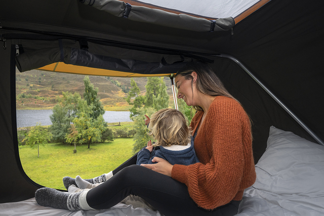 - Einfache Aufbewahrung: Dank der cleveren Konstruktion können Matratzen, Kissen und Decken im Zelt bleiben, wenn das Dachzelt wieder eingeklappt wird