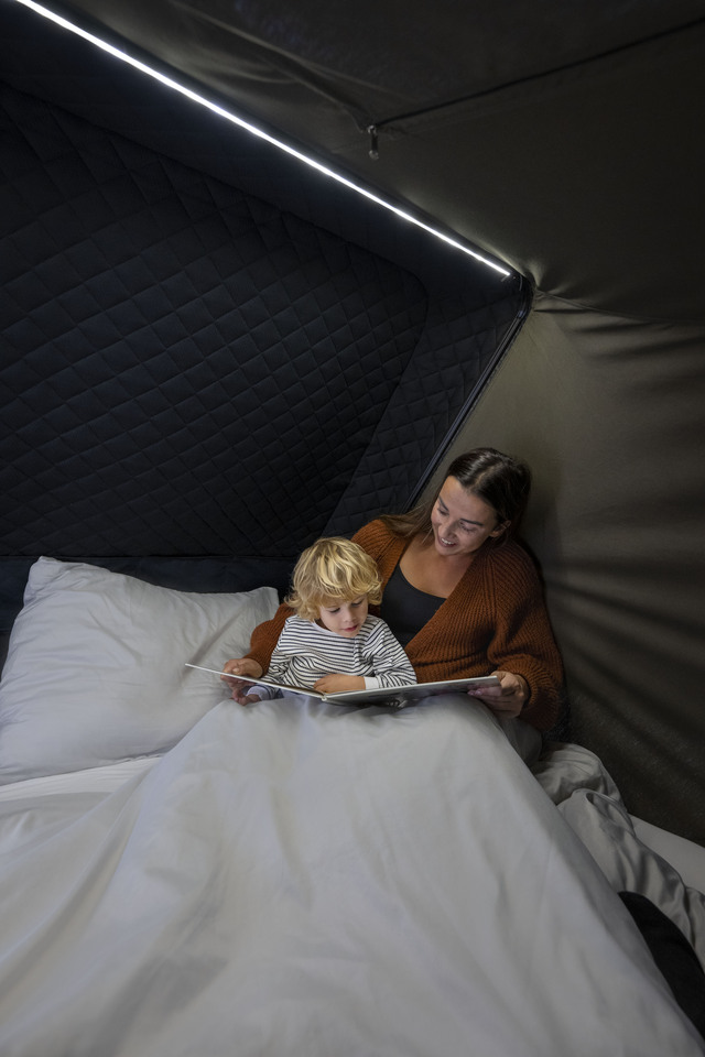- Integrierte LED-Beleuchtung: Das Hapro Vista verfügt über eine integrierte LED-Beleuchtung mit USB-CAnschluss. Die Lichtleiste ist perfekt in das zentrale Aluminium-Dachprofil integriert und erstreckt sich über die gesamte Länge des Dachzeltes
