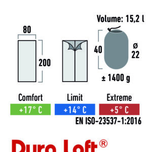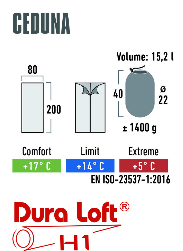 Der Außenbezug ist mit dem PFC-freien BIONIC-FINISH®ECO ausgerüstet. Diese umweltfreundliche und nachhaltige Ausrüstung ist schmutz- und wasserabweisend. Der Ceduna ist ein Komfort-Deckenschlafsack mit viel Bewegungsfreiheit. Er ist bestens geeignet für Camping, Festivals und für den Besuch bei Freunden. Die hochwertige Dura Loft® H1 Kunstfaser-Hochbausch-Füllung hat eine ausgezeichnete Wärmeleistung. Die Hohlfaser ist reißfest und zusätzlich silikonisiert damit eine gute Komprimierbarkeit und Bauschfähigkeit gewährleistet ist. Der Außenbezug ist angenehm weich und strapazierfähig. Das Innenfutter besteht aus einem atmungsaktiven und hautfreundlichen Material.