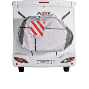 Eine ringsum geschlossene Hülle in welcher der Fahrradträger mitsamt den Rädern geschützt untergebracht ist. An der Rückwand befinden sich für die Haltebügel drei Reißverschlüsse in unterschiedlichen Höhen. Somit ist eine dichte Anpassung an unterschiedliche Träger möglich. Zusätzlich kann die Hülle außen durch diverse Spanngurte gesichert werden. Mit großer Glasklartasche für die Warntafel.