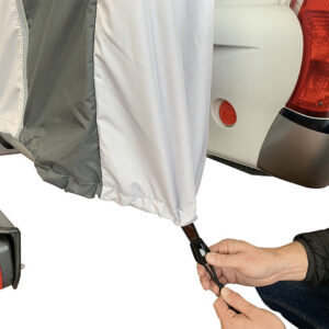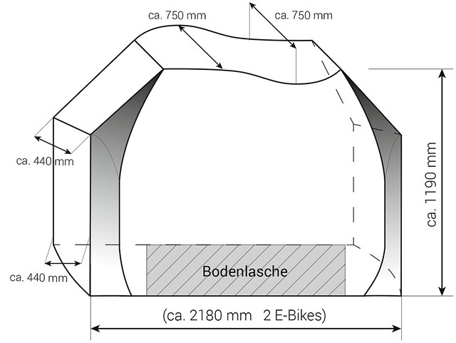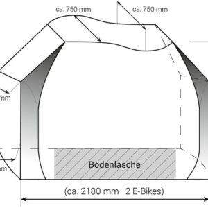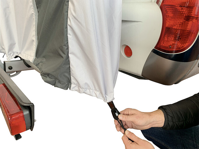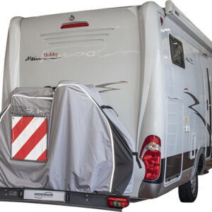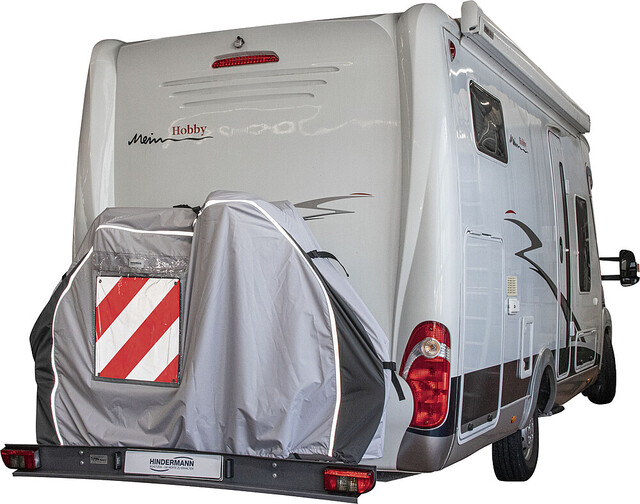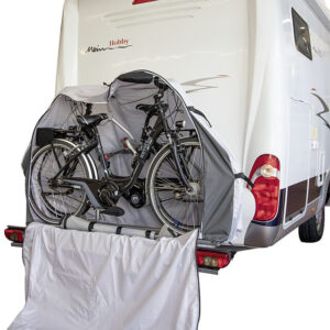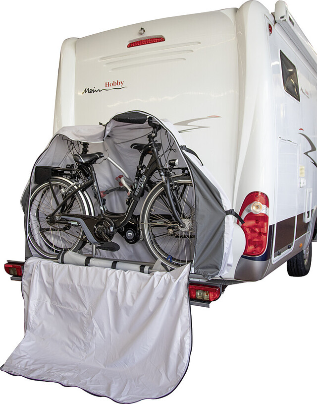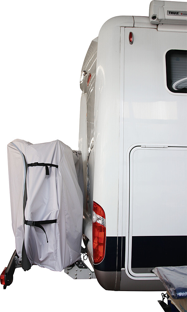 Die neue Bike-Schutzhülle PROFESSIONAL wurde speziell zum Schutz von bis zu 2 Fahrrädern entwickelt, die auf einem Heckbühnenträger am Reisemobil transportiert werden. Die kastenförmige Schutzhülle wird von oben über die Fahrräder gezogen und ist ringsum geschlossen. Um die Fahrräder bei montierter Schutzhülle leicht entnehmen und erneut aufstellen zu können, verfügt die Hülle über eine großzügig bemessene Frontklappe, die sich mittels der (reflektierenden) Reißverschlüsse öffnen lässt. Die Fahradschutzhülle PROFESSIONAL muss daher nicht jedesmal abgenommen werden und kann auf dem Träger verbleiben. Im mittleren Bereich der Unterseite ist eine fest verbundene ca. 80 cm breite Bodenlasche eingearbeitet, welche als Spritzschutz dient. In den Randbereichen unterhalb der Reifen ist die Hülle für eine einfachere Montage nicht geschlossen. Im Bodenbereich befindet sich rechts und links jeweils 1 Gummizug um einen relativ dichten Abschluß zu ermöglichen. An den Außenseiten rechts und links befinden sich jeweils 2 Gurte sowie auf der Oberseite 1 Gurt, um die Hülle abzuspannen. Somit ist ein zusätzliches Gurtsystem nicht erforderlich!