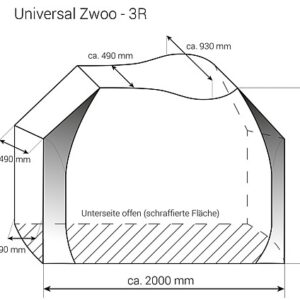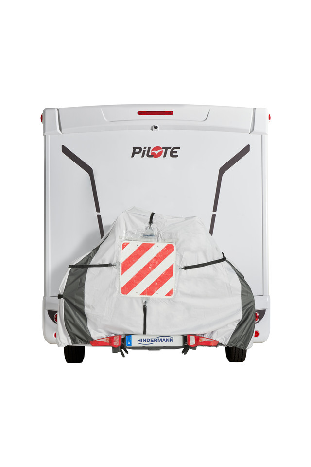 Die Schutzhülle ist in erster Linie konzipiert für auf Deichseln montierte Fahrradträger, aber durch die Kastenform ist sie universell einsetzbar, z. B. für Motorroller auf der Bühne. Sie wird von oben her über die Fahrräder gezogen. Entlang der Unterkante ist ein Gummizug eingearbeitet um die Hülle enger zu ziehen. Für die Anwendung am Reisemobil ist eine Glasklartasche für die Warntafel eingearbeitet. Zusätzlich ist ein Reflexionsstreifen eingenäht.