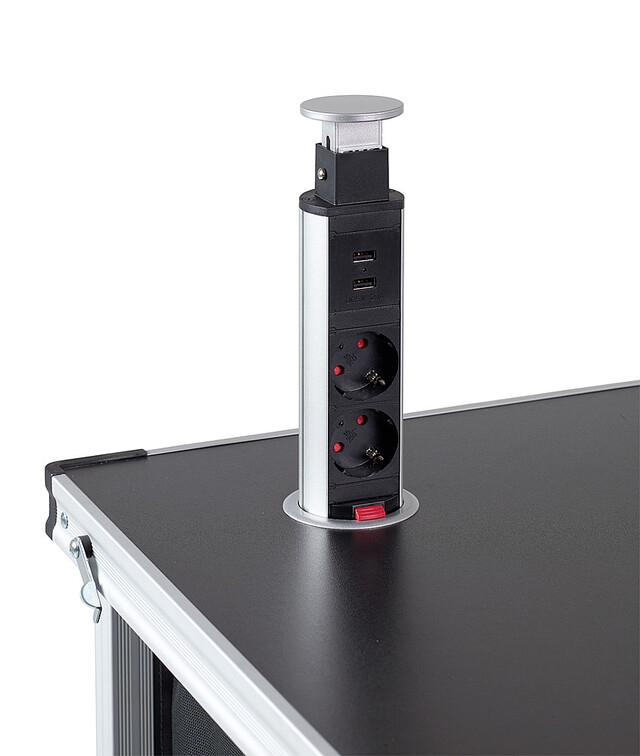 Stromversorgungstower mit 2 Schuko- und 2 USB-Anschlüsse passend für die Schränke Single und Double.