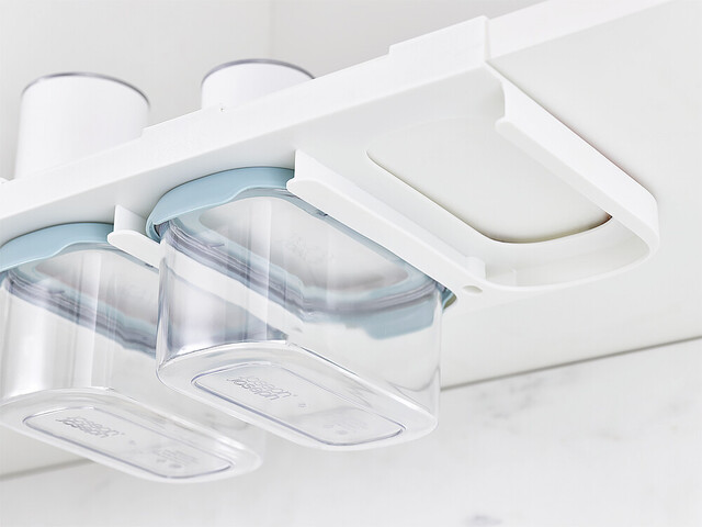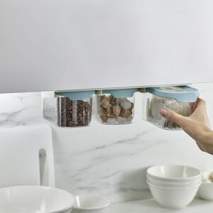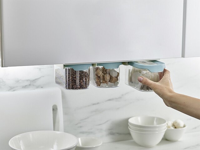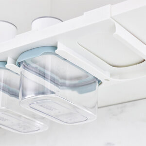 Das Set aus 3 Lebensmittelbehältern (je 900 ml) nutzt den Raum unter Regalen. Inkl. Ablageschiene. Luftdichte Deckel mit Easy-Pull-Laschen