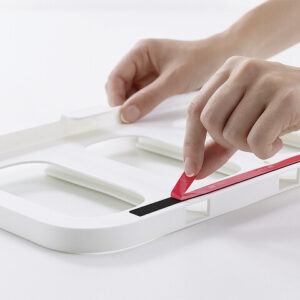 3. Haken über die Regalkante schieben und den Klebebandbereich 30 Sekunden lang fest andrücken
