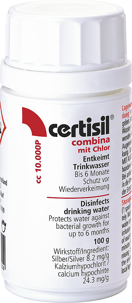 Trinkwasserreiniger mit Chlor , 100 g reichen für 10.000 l Wasser aus. Frischwasser in Süd- und Osteuropa und den Tropen enthält fast immer viele Bakterien und Krankheitserreger. Chlor desinfiziert Frischwasser aus unsicheren Quellen, Silberionen schützen bis 6 Monate vor Wiederverkeimung.