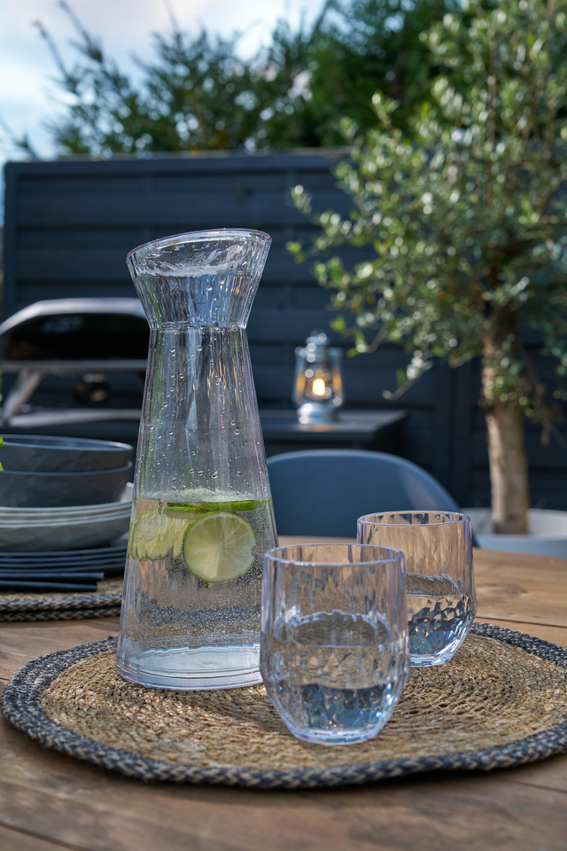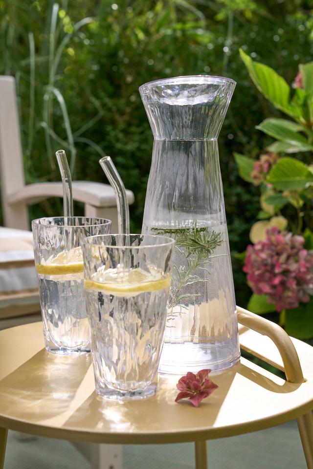 Schöner lassen sich Wasser, Saft, Eistee und hausgemachte Limonade nicht servieren. Die funkelnde Karaffe fasst einen Liter und hat einen originellen Kippdeckel, der sich beim Ausgießen sanft neigt, Früchte und Eiswürfel jedoch zuverlässig an Ort und Stelle hält.