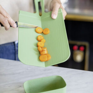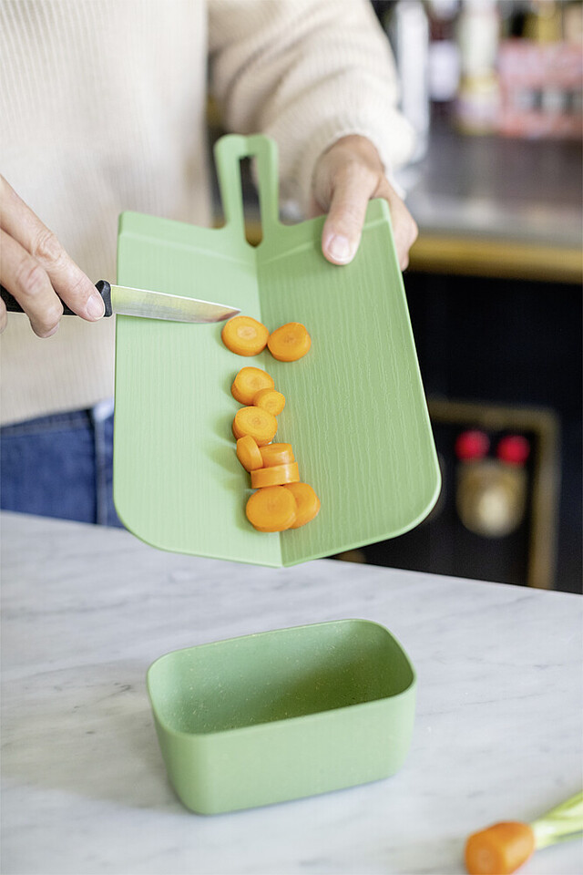 Erst schneiden, dann falten. Der Archetyp des Schneidbretts jetzt mit neuer Klappfunktion und wohl durchdachtem Design. Das Schneidbrett lässt sich durch den mittigen Falz anwinkeln und das geschnittene Gut rutscht sicher in den Topf oder die Schüssel. Der Einklappwinkel hat eine Arretierung zur leichteren Handhabung und der abgeschrägte Rand erleichtert das Anheben des Brettes.