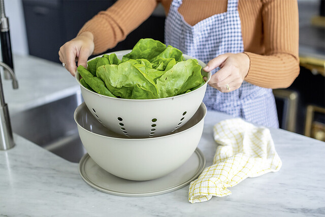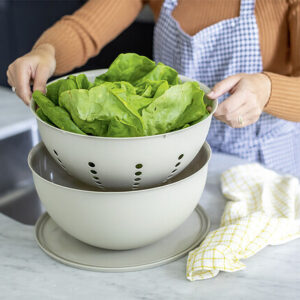 Die große Seihe mit zwei praktischen Grifföffnungen und dekorativer Lochung. Die Seihe passt perfekt in die große PALSBY L Salatschüssel und lässt sich damit platzsparend im Schrank verstauen.