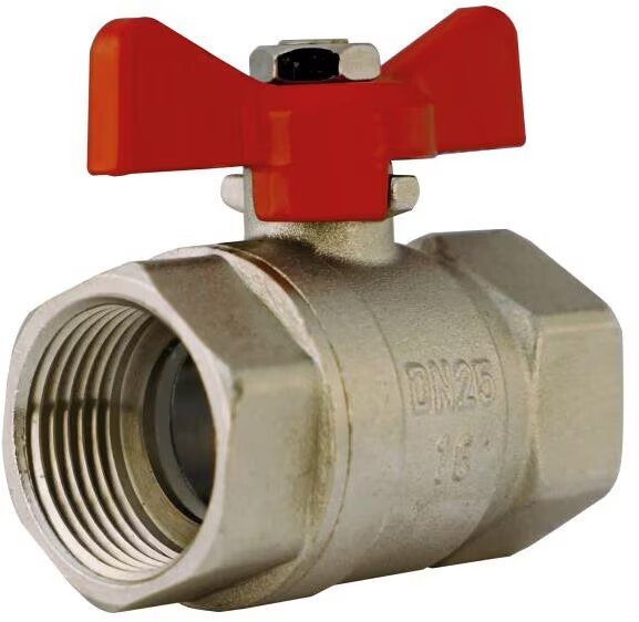 Absperrhahn mit beidseitigem 1€-Innengewinde-Anschluss.